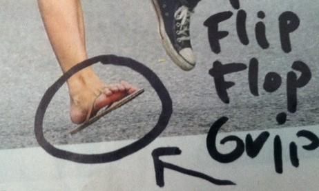 The problem with walking in flip-flops is that they simply do not stay secured to your feet without some amount of abnormal effort from the muscles of your foot and lower leg. Basically, your toes have to grip the sandal each time you lift your foot off the ground in order to keep it from sliding around or falling off your foot. Notice the "flip-flop grip" pointed out by another foot-savvy blogger in the photo below. That may not seem like such a big deal, but after just a few hundred repetitions (which would be a very conservative number for something as seemingly minor as a trip to the grocery store) that compensation will start to fatigue the muscles of the foot and lower leg. With enough repetition and muscular fatigue, this could, and often does, begin to develop into muscle strain and injury.